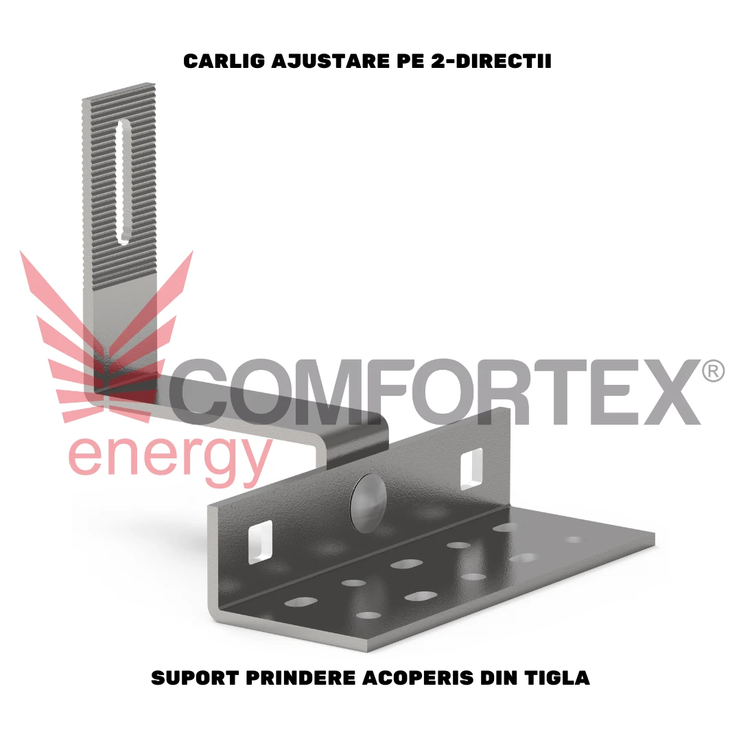Cârligul de prindere pentru acoperișuri din țiglă, ajustabil pe 2 direcții, este o soluție eficientă pentru montarea panourilor solare pe acoperișuri înclinate, acoperite cu plăci ceramice sau de beton. Acest sistem de prindere pentru panouri solare, permite reglarea poziției atât pe verticală, cât și pe orizontală, facilitând o instalare optimă a panourilor în funcție de particularitățile acoperișului.