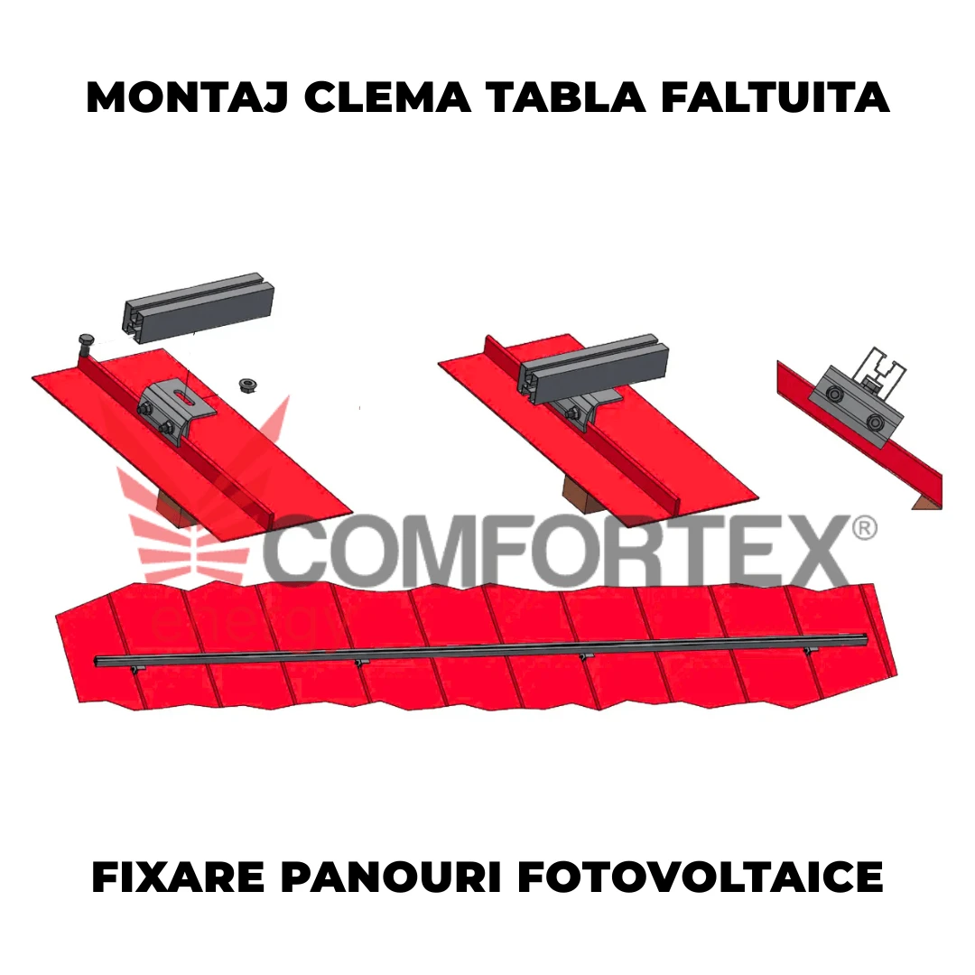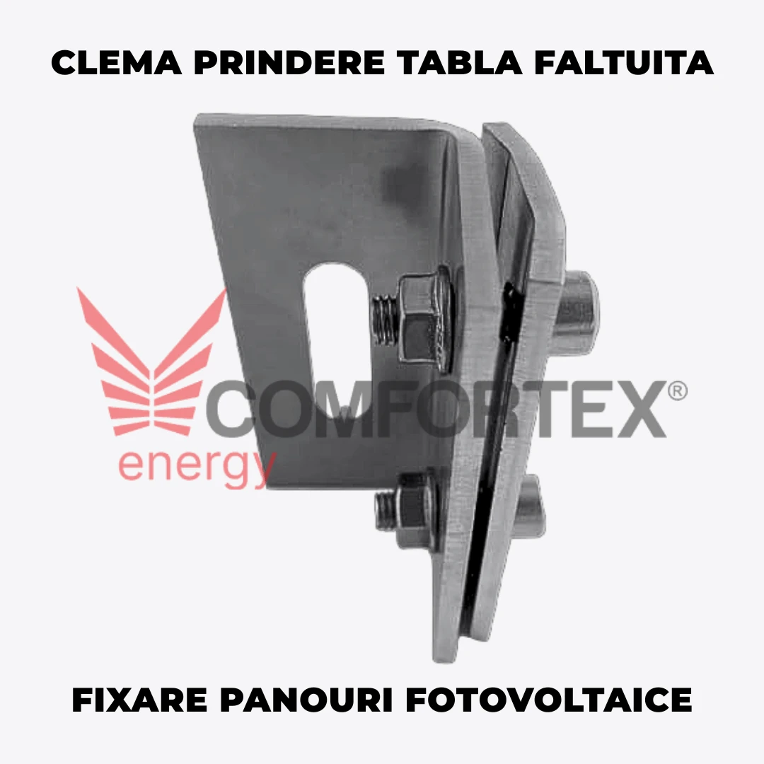 Clema pentru tablă fălțuită este un sistem de prindere utilizat pentru fixarea sigură a panourilor solare pe acoperișuri metalice.