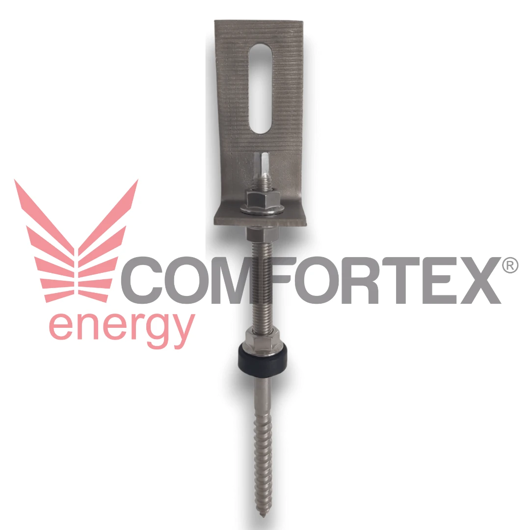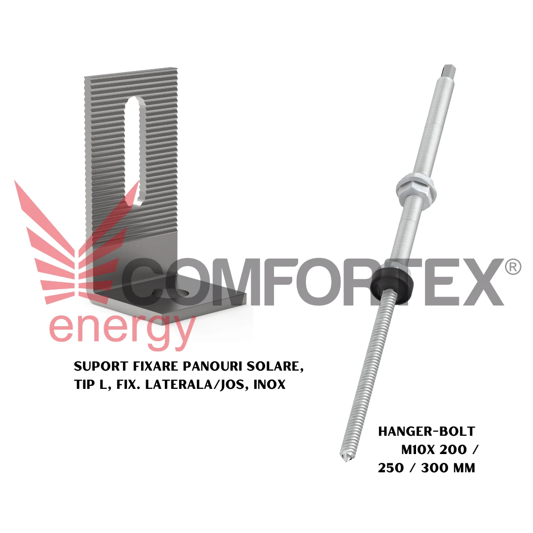 Acest kit de montaj pentru panouri fotovoltaice conține un adaptor "L" fabricat din oțel inoxidabil și un șurub Hanger Bolt M10, cu lungimi de 200 mm, 250 mm sau 300 mm, fiind ideal pentru fixarea panourilor pe acoperișuri înclinate din tablă, țiglă metalică, șindrilă bituminoasă sau pâslă de acoperiș.