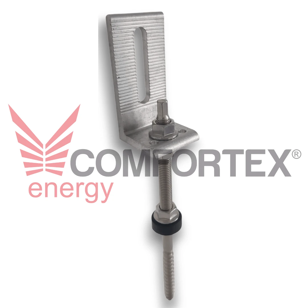 Este ideal pentru acoperișuri din tablă, țiglă metalică, șindrilă bituminoasă sau pâslă de acoperiș, oferind o soluție eficientă pentru instalarea panourilor fotovoltaice. Suportul "L" din aluminiu este proiectat să asigure o legătură solidă între șuruburile cu filet dublu și suprafața metalică a acoperișului.