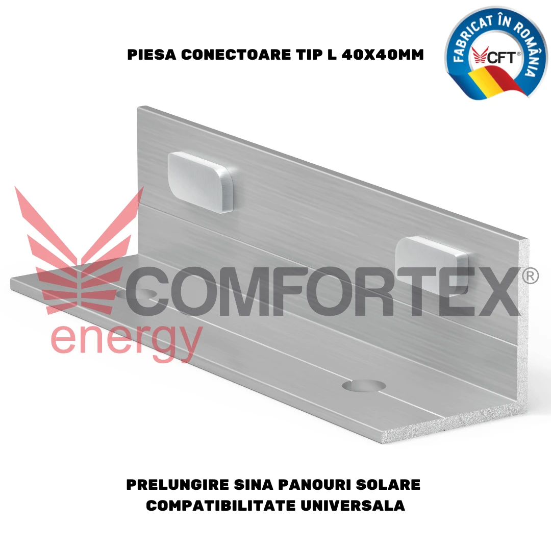Piesa conectoare model tip “L”, pentru prelungirea profilului aluminiu 40x40mm utilizata in sistemele de montaj panouri fotovoltaice, ideala pentru conectarea si extinderea profilului de aluminiu, mentinand in acelasi timp stabilitatea si rezistenta structurii.