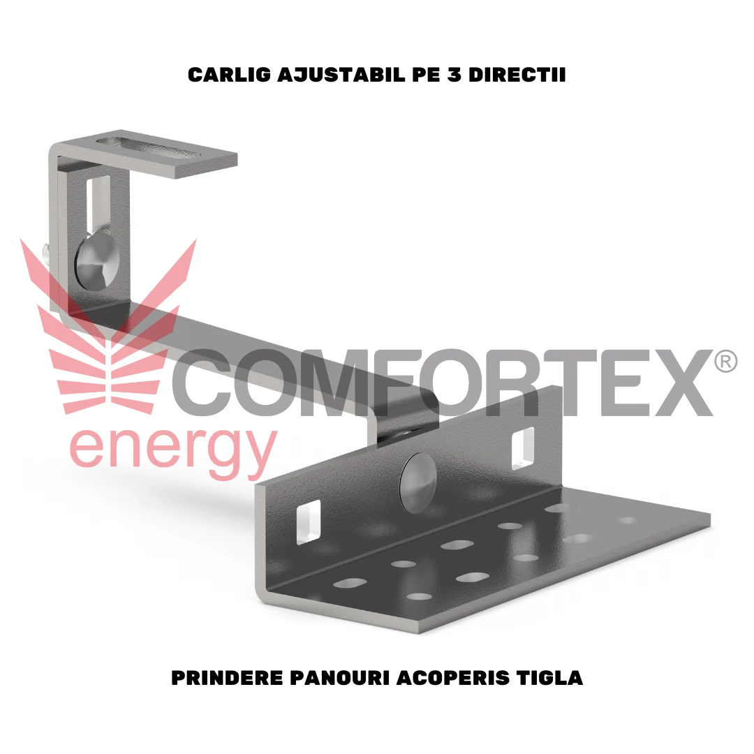 Cârlig ajustabil pe 3 direcții, face parte din categoria sisteme de prindere pentru panourile fotovoltaice. Acest produs este fabricat pentru a fixa panourile solare pe acoperișurile inclinate sau acoperite cu țiglă ceramica / beton. Datorită ajustabilității sale, acest cârlig de prindere poate fi montat pe 3 direcții diferite, astfel permițând o fixare solida si precisa, pe orizontala sau verticală, fiind compatibil cu o mulțime de acoperișuri și sisteme fotovoltaice.