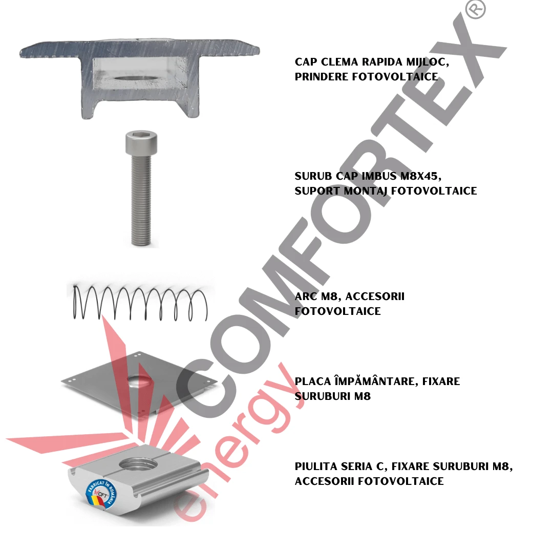 Setul complet include: o clemă de prindere, un șurub M8x45 din oțel inoxidabil, o piuliță din seria C de aluminiu, o placă de împământare esențială pentru egalizarea potențialelor și un arc pentru flexibilitate. Aceste componente sunt compatibile cu diverse sisteme de montaj și tipuri de acoperișuri (țigle metalice, șindrilă bituminoasă, țiglă ceramică sau tablă fălțuită).