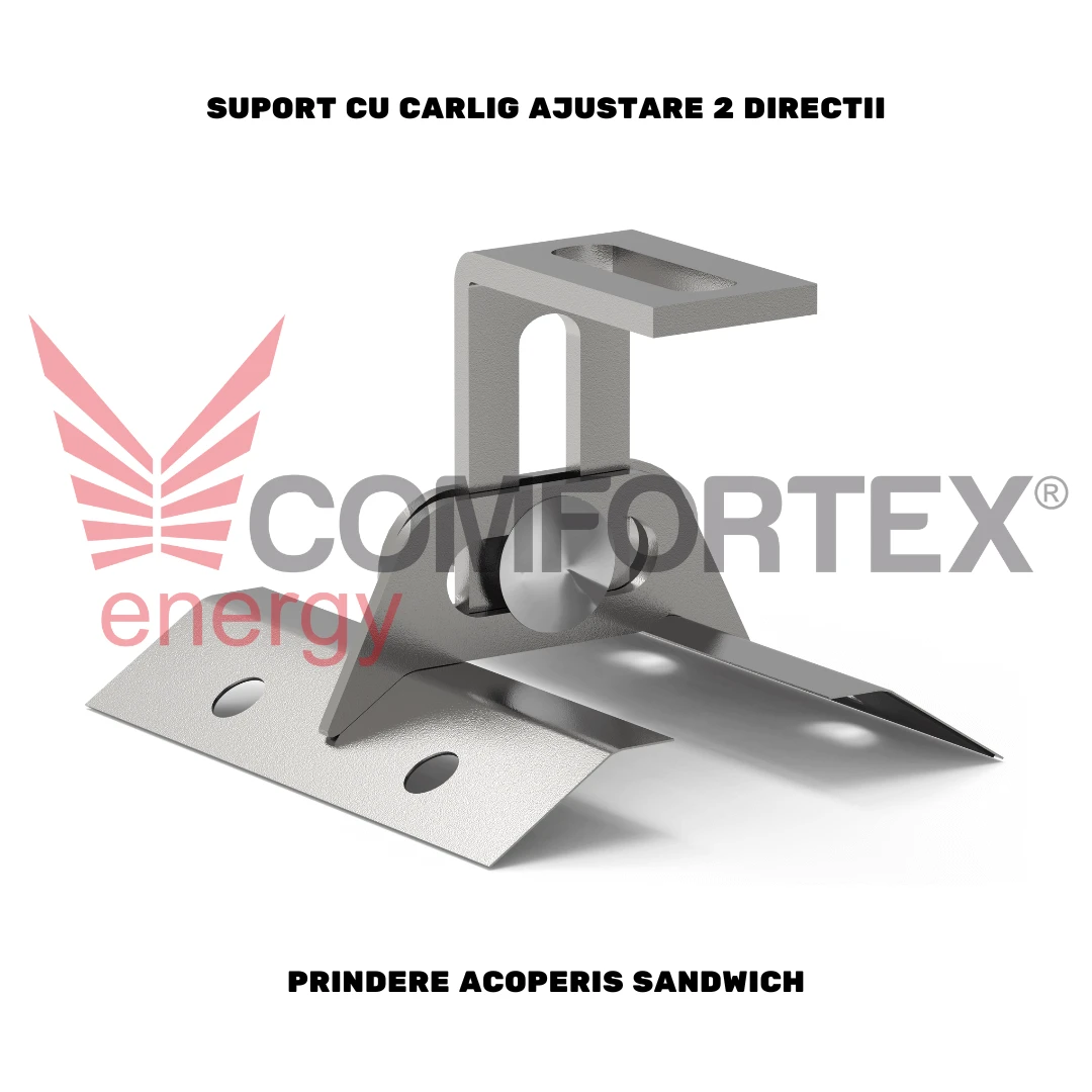 Acest sistem de prindere reglabil este proiectat special pentru instalarea sistemelor fotovoltaice pe acoperișuri din tablă tip sandwich sau cutată. Fabricat din oțel inoxidabil și dotat cu bandă EPDM, suportul oferă rezistență superioară la apă, umiditate și substanțe chimice slabe, garantând o fixare sigură și durabilă pentru panourile solare.