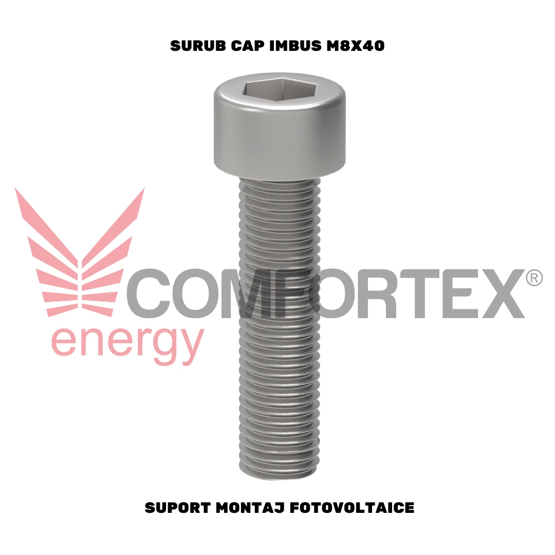 Șurubul cu cap imbus M8x40mm este un element esențial în montajul sistemelor fotovoltaice, având rolul de a conecta și fixa componentele într-un mod sigur și durabil. Fabricat din oțel inoxidabil A2, acesta oferă o rezistență excelentă la coroziune, fiind ideal pentru utilizare în medii expuse la condiții de umezeală sau în aer liber.